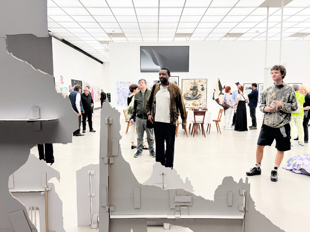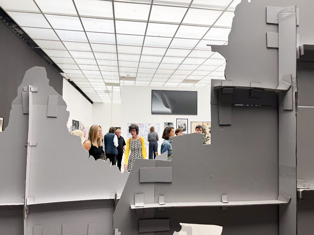 „Die Rauminstallation animiert dazu, frech zu sein und zu schauen, was sich dahinter verbindet“, sagte Kurator Tobias Loemke. Ein Blick hinter die Aufsteller, die die Bildwelten tragen, offenbare ebenso kühne, abenteuerliche Elemente, so Loemke. Die blanke Pappe, die mit Kleber zu charmanten Standbeinen verschachtelt ist, hält standhaft das Gesamte. Die Standbeine sind Zeugen für die pure Handarbeit, die hinter dem Gesamtwerk steckt.