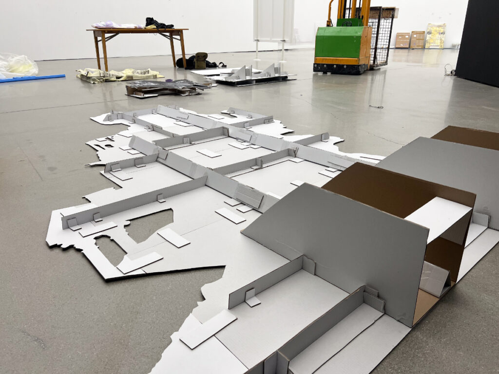 Berg und Talfahrt ist eine installative Raumcollage, die Landschaft nicht abbildet, sondern infrage stellt. Sie schafft keine Kulisse, sondern ein begehbares Gelände, das sich als fragiles Denkmodell zwischen Konstruktion und Erosion entfaltet. Aus geschichteter Wellpappe, fotografischen Fragmenten, Druckelementen und architektonischen Versatzstücken entsteht eine topografische Struktur, die mehr Fragen stellt als Antworten gibt. Die Installation ist raumgreifend, aber nie geschlossen – sie reagiert auf den Ort, bleibt offen für neue Blickwinkel, Übergänge und Bedeutungen.