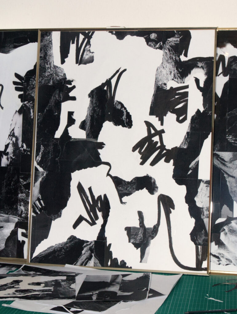 Das Herzstück der Ausstellung ist die Schwarz-Weiß-Raumcollage, eine großflächige Symphonie aus Landschaftselementen und abstrakten Strukturen, die die gesamte Ausstellungsfläche durchzieht. Auf Papier gedruckte Fotos, kunstvoll auf dünnen Holzplatten befestigt, erzeugen visuelle Schichten, die meisterhaft alte und neue Techniken verweben. Diese Collage ist so konzipiert, dass sie die topografischen Facetten einer Landschaft – von tiefen Tälern bis hin zu majestätischen Gipfeln – nachbildet und die Besucher einlädt, die Landschaft aktiv zu erkunden. Die Wanderung durch die Gänge und das Erklimmen unterschiedlicher Höhen schafft eine tiefgreifende und sinnliche Erfahrung.